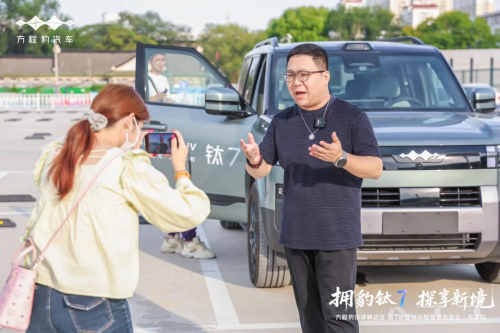 活动现场,方程豹汽车天津直营中心内训讲师 李海龙先生详细地介绍了钛7的性能。外观上,钛7近5米车长,近2米车宽,方正宽大有型又霸气;在车内,更是为用户营造了一个五向通透的无限风景视界。钛7的内饰设计,也在“方圆”的魔术之间展开,既有硬朗的简约时尚,又有家用的柔和温馨。