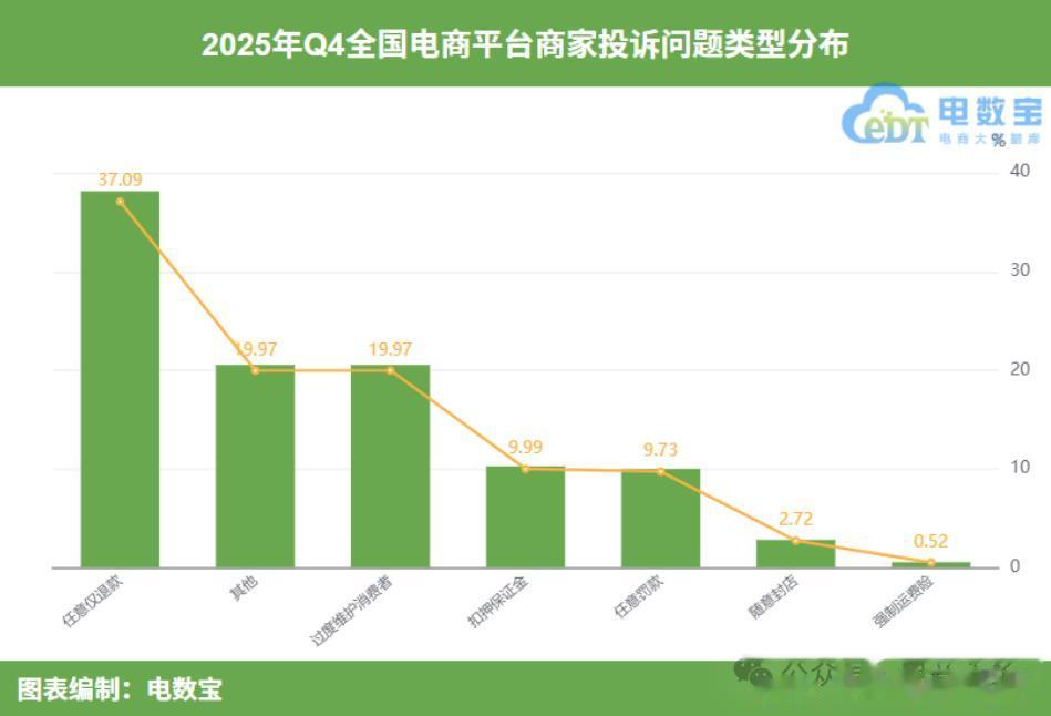据第三方消费服务平台“电诉宝”监测,在2025年第三和第四季度,全国电商商家投诉中关于“任意仅退款”问题的占比,已稳定在37%左右。这一数字相较于同年第一季度曾高达50.36%的峰值,呈现出显著且持续的回落。