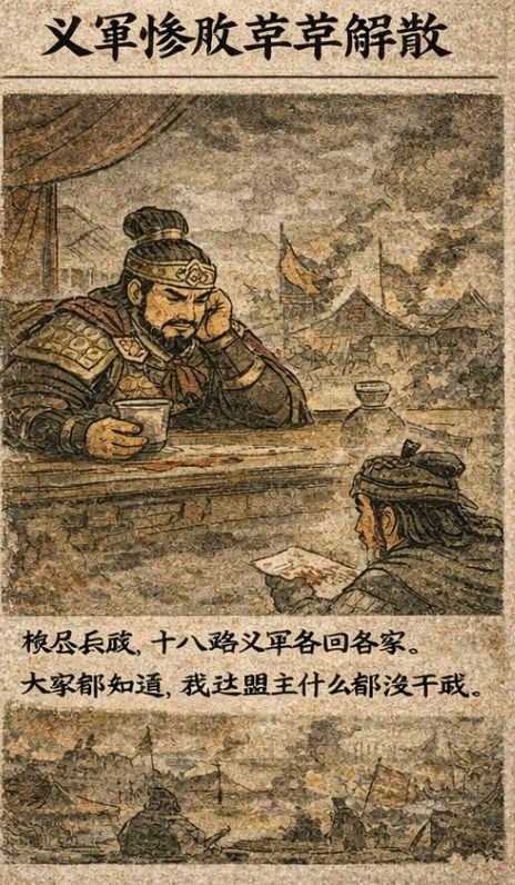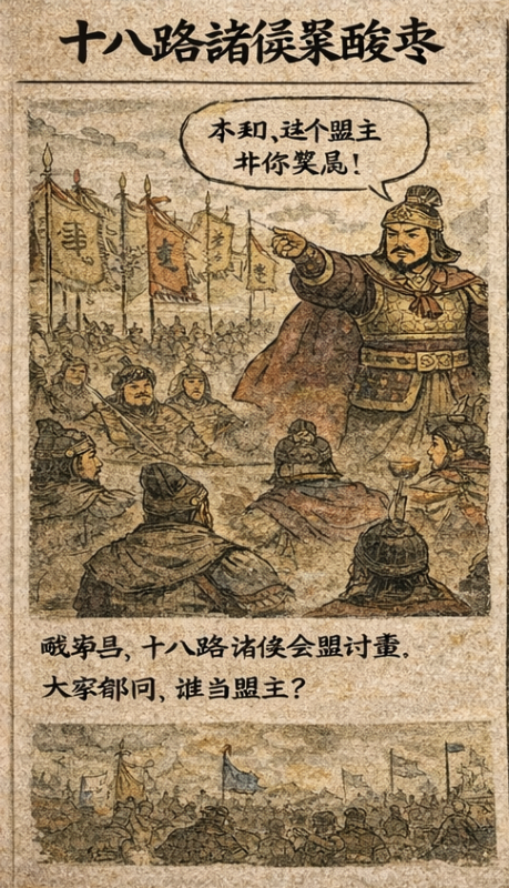 后来你们都知道,诸侯散了。粮尽,兵疲,各回各家,各找各妈。董卓自己烧了洛阳,跑了。我们这十八路诸侯,除了曹操追了一下,没人再往前一步。