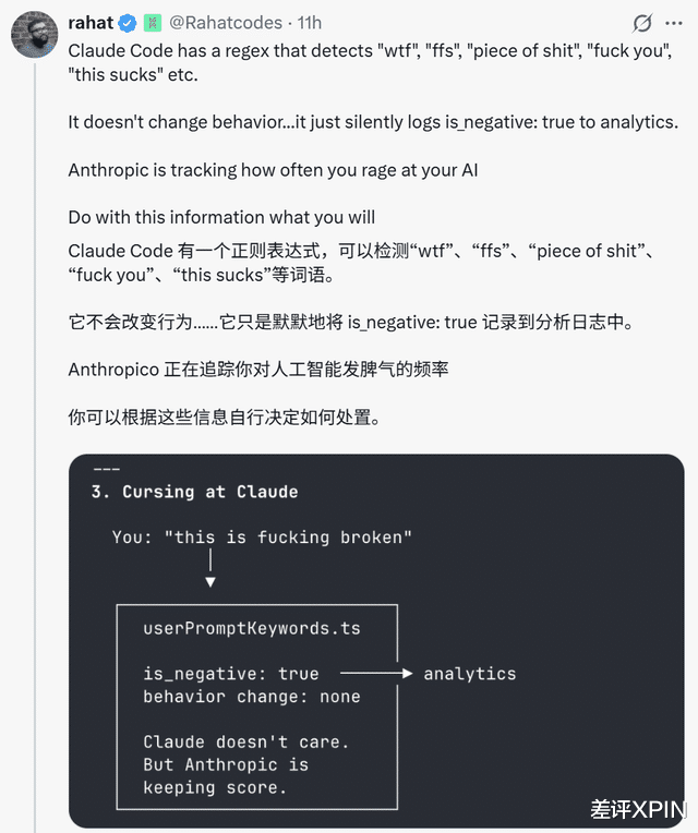 就比如就有网友发现 Claude 会默默记录你对 AI 发了多少次脾气,骂了它多少次。。。