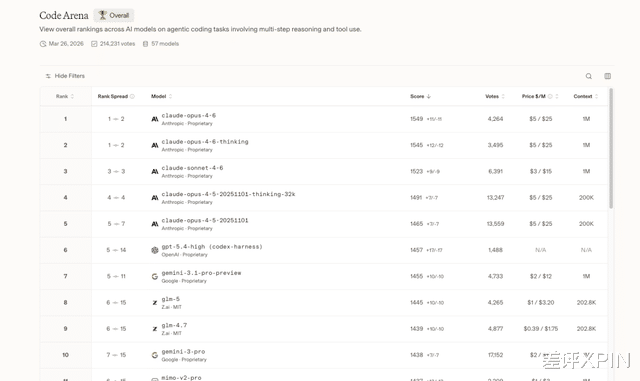 打开大模型竞技场,选到编程能力这一块儿,你就会发现一个极其恐怖的现象:前五名的模型直接被 Claude 一家给包圆了。