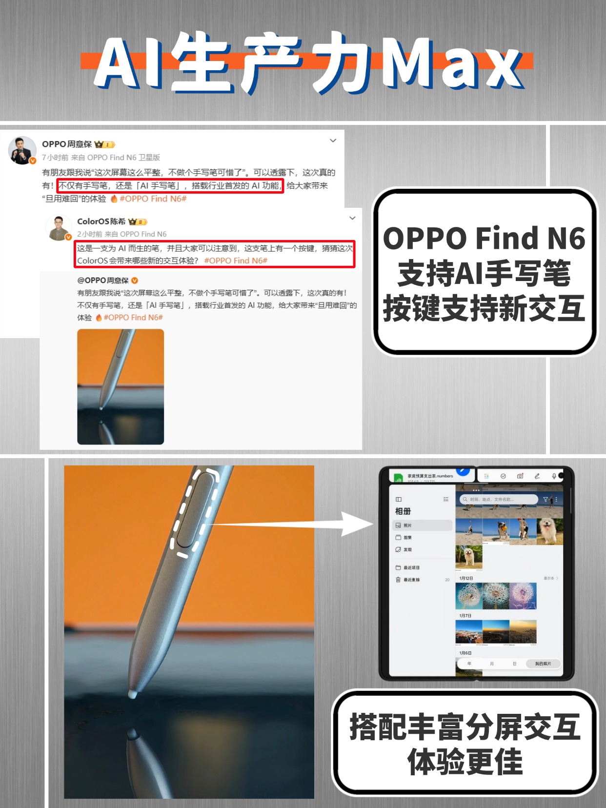 AI 手写笔赋能AI生产力:行业首发带AI功能的手写笔,ColorOS陈希透露按键交互不简单,搭配ColorOS丰富分屏交互AI生产力直接Max。