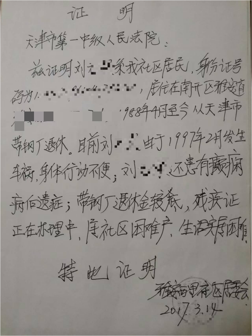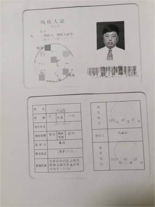 1997年2月,他被出租车撞伤且对方肇事逃逸,造成左额叶脑挫裂伤、多部位颅骨骨折等多处重伤,后续引发癫痫病后遗症,经鉴定为智力残疾二级,2017年取得残疾人证。如今刘先生仍在人民医院住院,确诊脑栓、脉管炎(黑腿)等病症,均为早年负伤和事故后遗症,医生告知其腿部破损无法愈合,需接受截肢手术。他自2004年起便居住在天津市南开区雅安西里1-5-301,这是其唯一住房,因身残多病、经济困难,被社区列为困难户。
