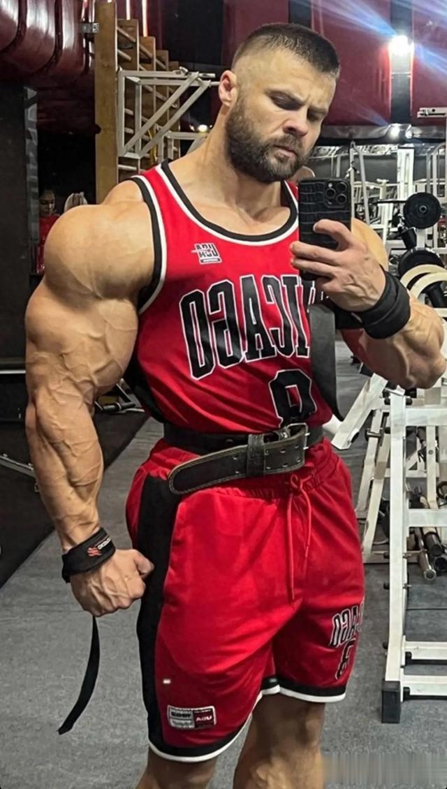 他叫杰克,今年28岁,来自美国芝加哥市。从照片上看,他有着棕色的头发和胡须,眼神坚定有力。杰克的身材高大魁梧,肌肉线条分明,显示出他很注重体育锻炼,尤其擅长举重等力量型运动。他身穿红色背心,胸前印有“CHICAGO”的字样,下身搭配红色短裤,腰间系着一条黑色的皮带,增添了几分时尚感。左手手腕上戴着一只黑色护腕,可能是为了保护自己在进行高强度训练时不受伤害。