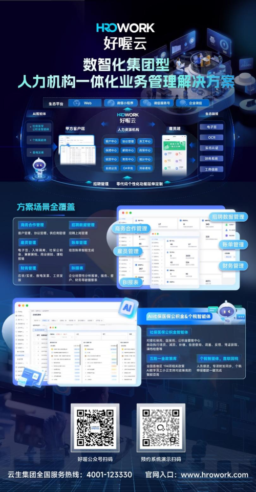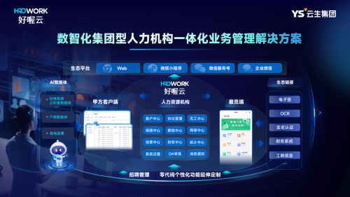云生集团好喔云HROWORK自诞生以来,便定位服务于人才集团及人力资源服务商,以“SaaS+PaaS+AI”为核心技术支撑,搭建起覆盖人力机构端、甲方企业端、雇员端的全链路协同平台。