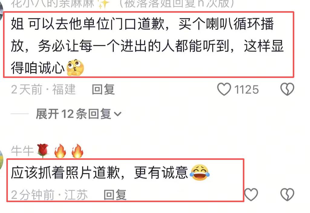 还有网友说:“你应该去女方单位道歉,最好当着小三的面,让对方感受到你的真诚,要见不到对方,也可以用高音喇叭循环播放,让对方能亲耳听到。”