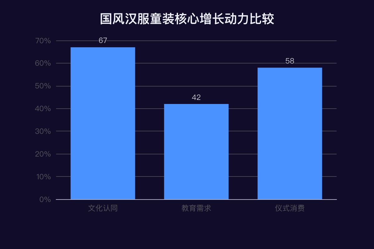 增长动力三维度解析1. 文化认同:从情感共鸣到消费转化家长对传统文化的重视程度持续提升,推动文化认同成为核心购买动机。调查显示,67% 的消费者将“文化认同”列为购买国风汉服童装的首要原因,超过 70% 的家长明确表示愿意为孩子购买汉服产品。消费升级背景下,家长对童装的需求已从基础穿着转向文化内涵表达,汉服童装通过传统纹样、形制还原等设计元素,满足了新一代父母对文化传承的情感诉求。