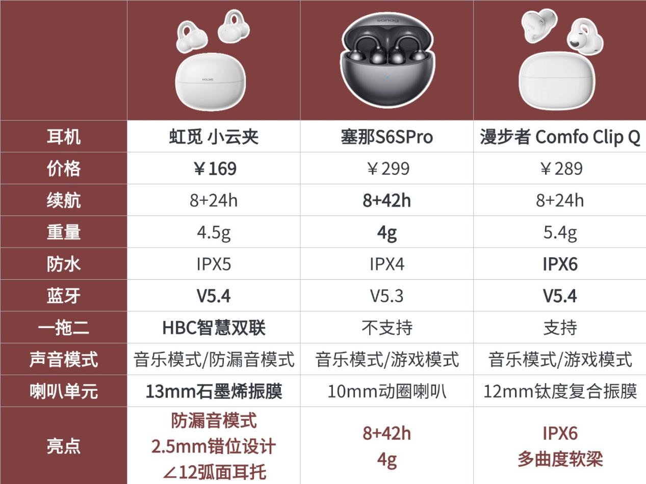 面对市面上功能相似、价格却相差甚远的耳夹式耳机,你是否感到选择困难?单看任何一款产品的宣传都觉得很完美,但究竟哪一款的体验能真正经得起细节的推敲?为了终结您的纠结,我们选取了虹觅 小云夹、塞那S6SPro、漫步者 Comfo Clip Q,通过长达数周的同步深度体验,为您带来这份横向评测报告。我们关注的不只是参数,更是参数背后真实的日常使用感受,帮您看清每一款的真正优势与短板。