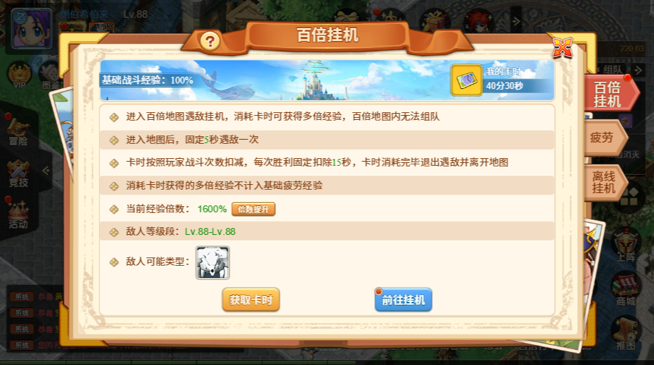进入条件:玩家进入百倍地图进行遇敌挂机,需要消耗卡时来获取多倍经验。在百倍地图内无法组队,进入地图后,固定每 5 秒遇敌一次 。