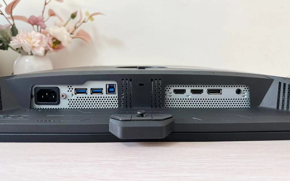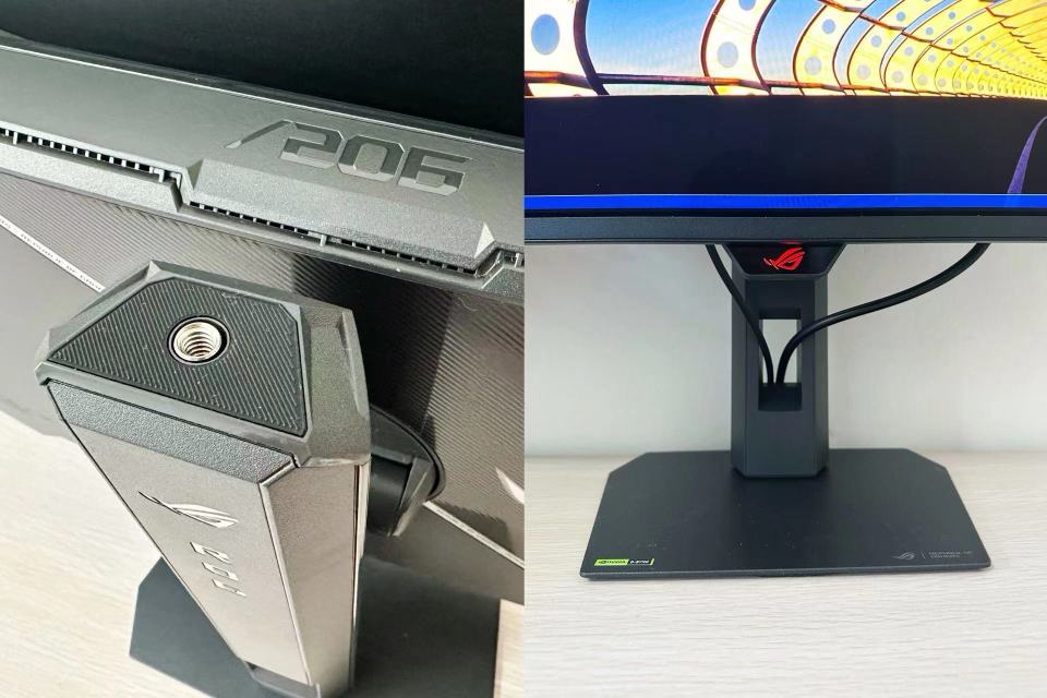 ROG XG27UQDMS支架顶部有个很巧妙的设计,一个¼英寸三脚架接口。可以装摄像头、补光灯或者麦克风。咱们开视频会或者直播的时候,直接把相机架在上面,角度刚好,不用额外占桌面空间;支架下方还有理线槽,能把电源线、视频线都收起来,桌面看起来清爽不少;底座是方形设计,比传统的大V型底座省地方。