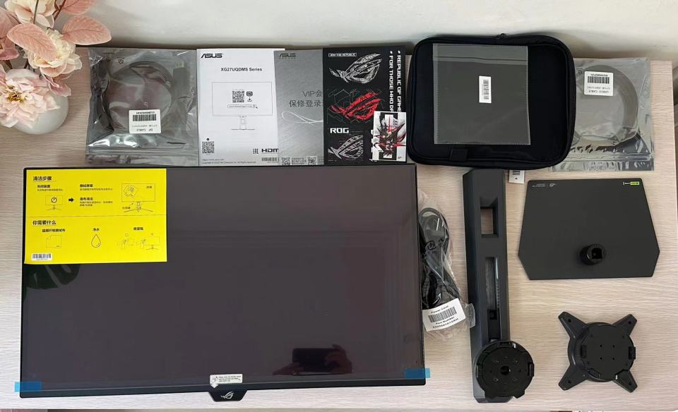 我在拿到快递的第一时间就迫不及待地拆开了。除主机外,配件包括ROG DisplayPort 连接线、ROG USB 连接线、电源线、ROG壁挂安装套件、快速入门指南、保修卡、超细纤维布、ROG贴纸和ROG 包。该有的都有了,主打一个一步到位。