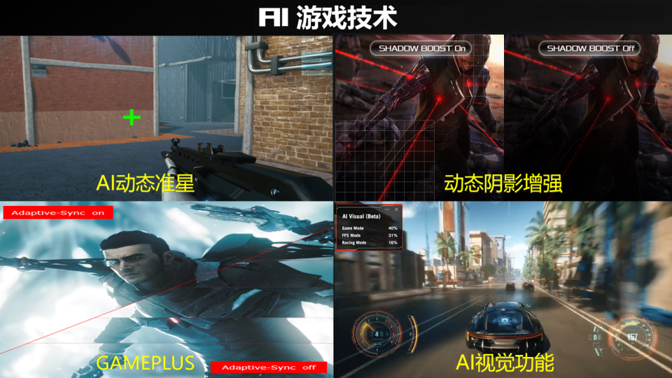 ROG游戏 AI技术包括动态阴影增强、可变OD、动态十字准线、狙击手、FPS计数器、定时器、秒表、显示对齐等 功能,每个都好用不鸡肋。