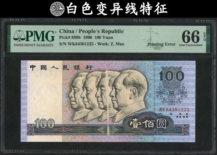去年12月份的时候,有一张1990年的100元,在纸币正面人像中间清清楚楚多了一条白色的竖直线。