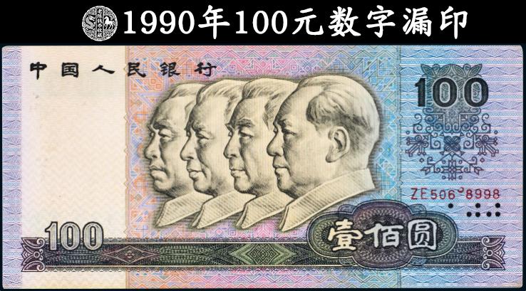 去年年末同样是这样,还有一张1990年的100元,外观普普通通,可认真查看它的冠字号时,发现里面有一个数字8的下半部分,居然漏印了,看起来像3却又不是“3”。