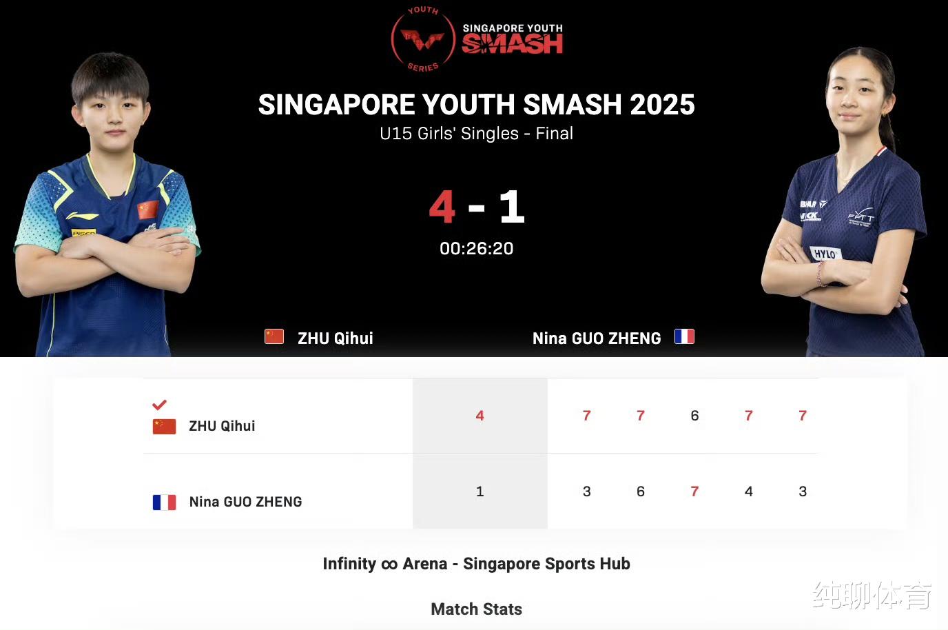 其中祝启慧在今年2月份举行的首届WTT新加坡青少年大满贯赛中,勇夺U15年龄段女单冠军,决赛4-1战胜了比其大2岁的法国选手郭铮,要知道当时的祝启慧还未满13周岁!