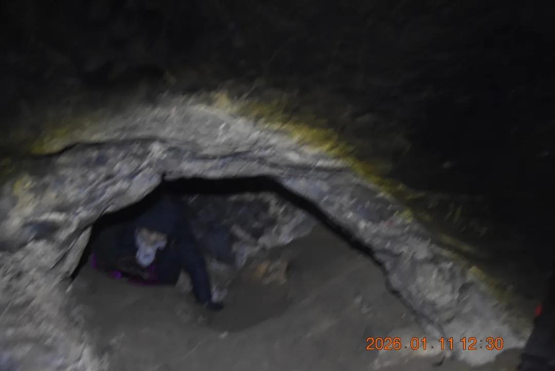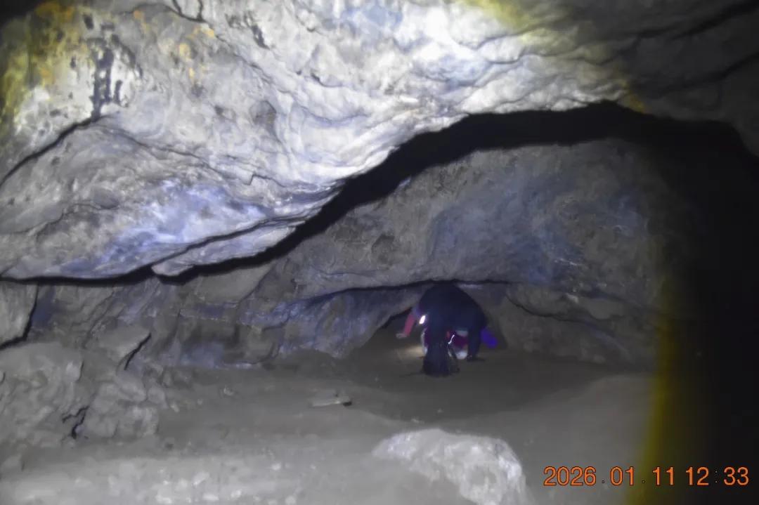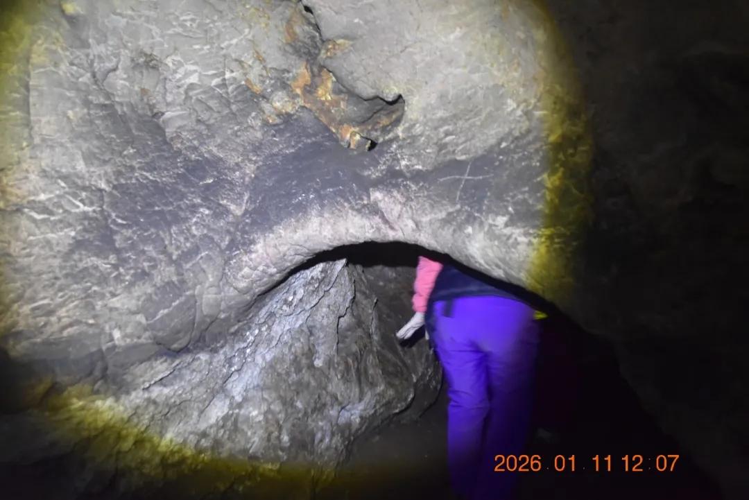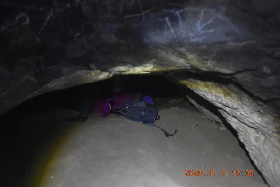 进了小洞口十 来米,就更低了,低到只能爬着进。背着包就爬不进来了,我们把包放到了外面,因为我是第一次带人来,完全不知道里面是什么情况,所以还是很紧张的,不敢头朝前爬着进,只能爬着倒退的进,感觉更安全些,至少头在外面,万一有什么情况,往出爬更方便些。