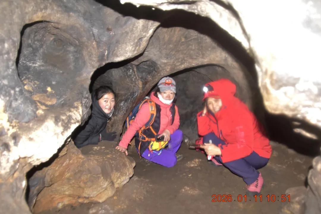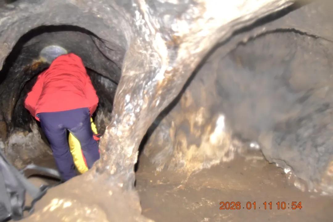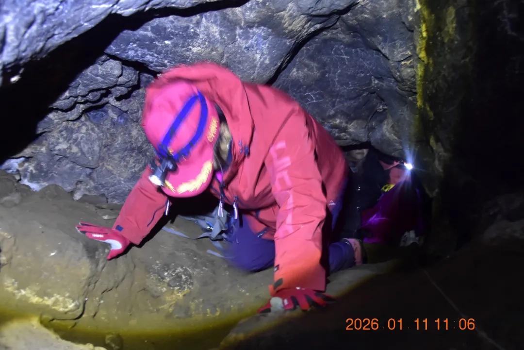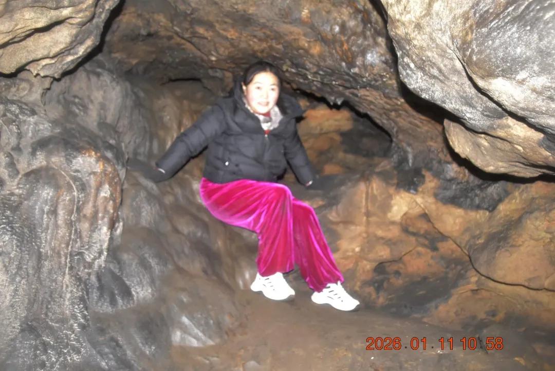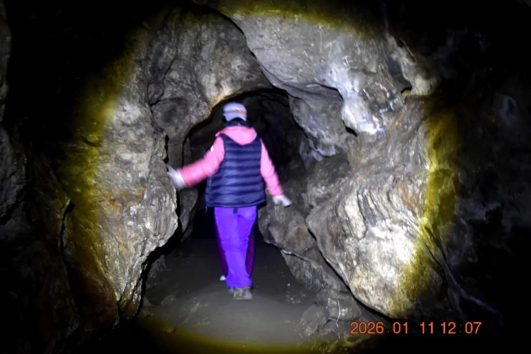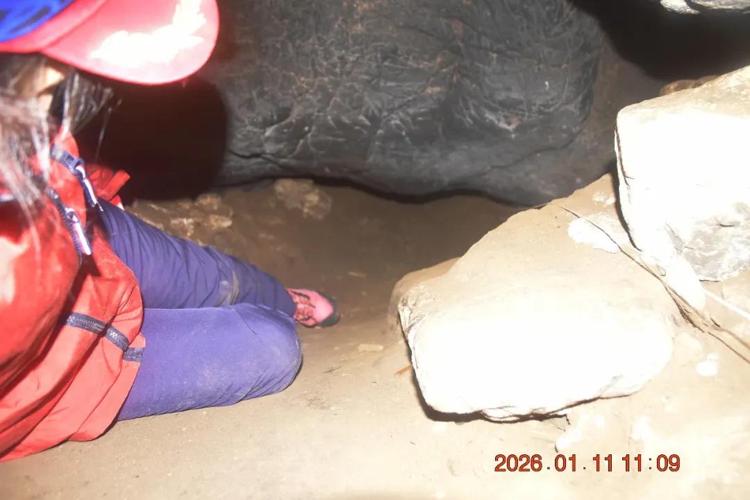 弓步猫腰进洞,窄到只能下蹲前行,这是仙明洞的第一大考验!接下来的洞腔完全需要匍匐前进,