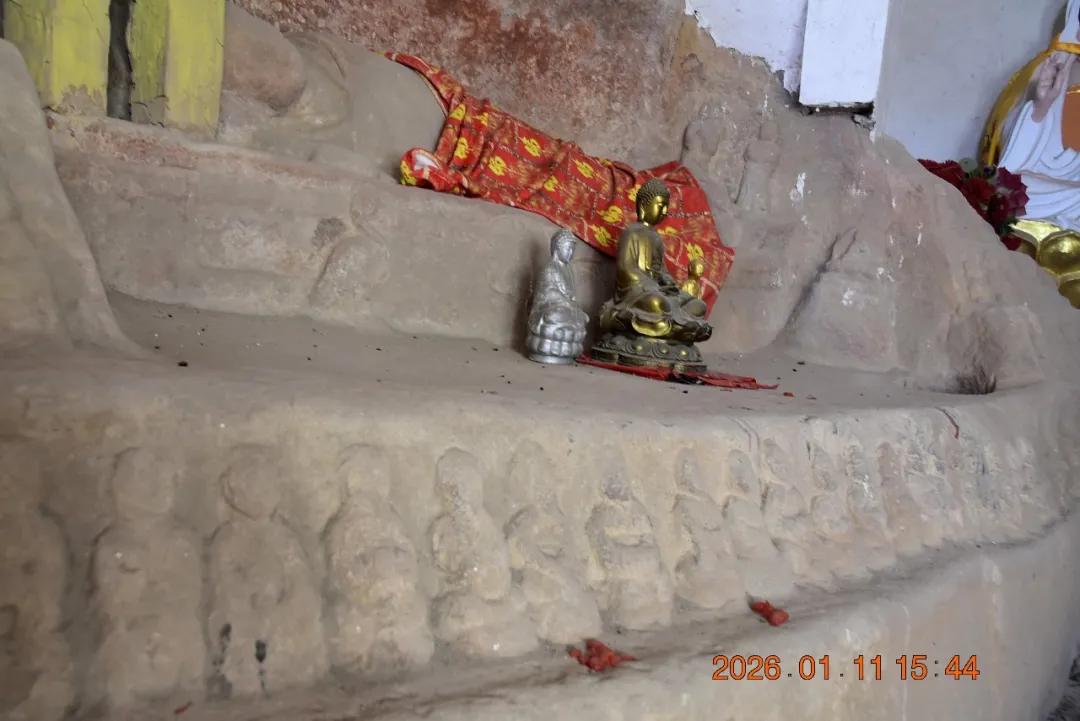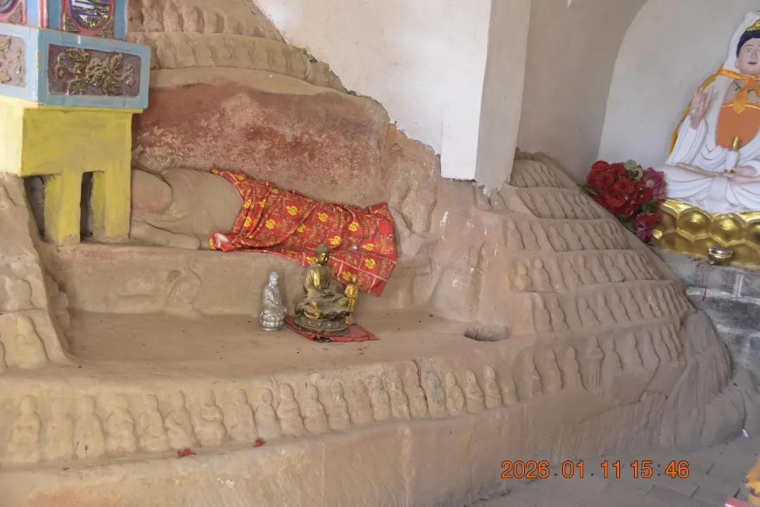 卧佛涅槃像:长2.1米,裹袈裟呈安详卧姿,象征佛教最高境界,四周环绕191尊小石佛。