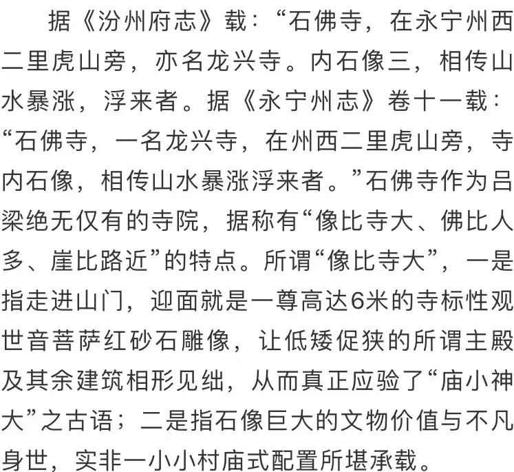 综观石佛寺有“三奇”:一曰露天凿像,有别于其它寺院之石窟造像;二曰主像侧卧,在全国石佛中可谓绝无仅有;三曰以佛建殿,开启以石佛建殿之先河。寺中石佛依石而刻,大小错落,分排挨列,百千而聚,连绵重叠,雕刻精巧,置于山巅,山岚缭绕,宛如天成,实乃吕梁历史文化遗存之瑰宝。