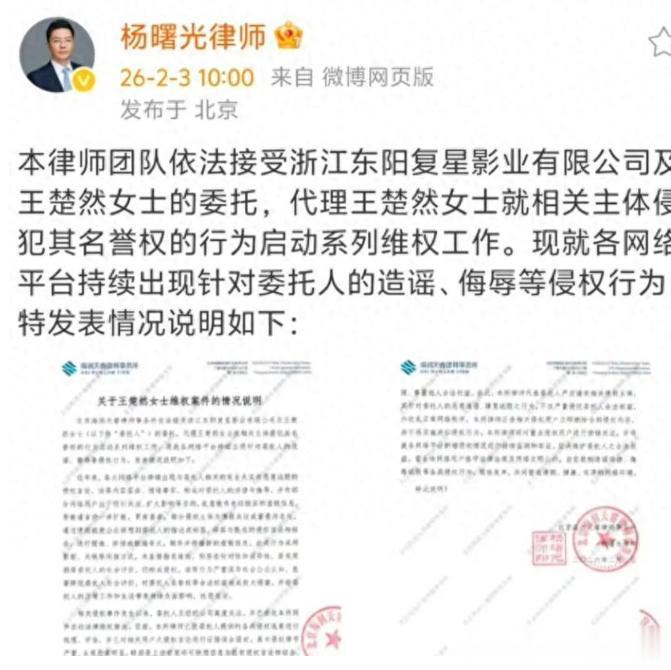 02在宋佳工作室发布严正声明的前一天,也就是2026年2月3日,王楚然方面也委托律师发布了告黑声明,同样是态度坚决,明确表示要追究侵权者的法律责任,维权到底。
