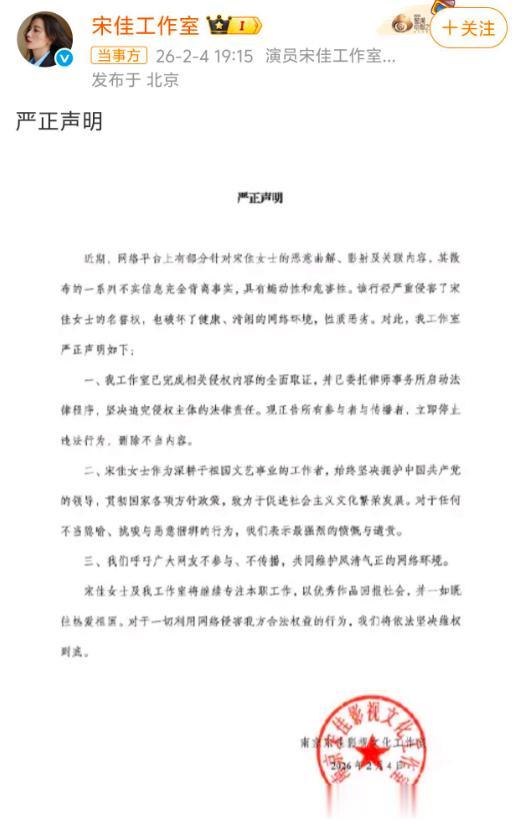 012026年2月4日,宋佳影视文化工作室通过社交平台,发布了一则针对宋佳本人的严正声明,用词强硬,态度坚决,明确表示将依法坚决维权到底,绝不姑息任何侵权行为。