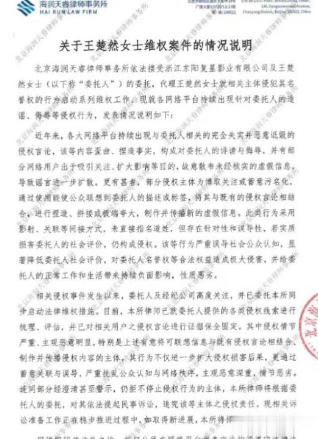 律师声明中还提到,自从这些侵权事件发生以来,王楚然本人和她的经纪公司一直都在密切关注相关情况,也早就委托律师事务所启动了法律维权的相关措施,并不是一时冲动才决定告黑。