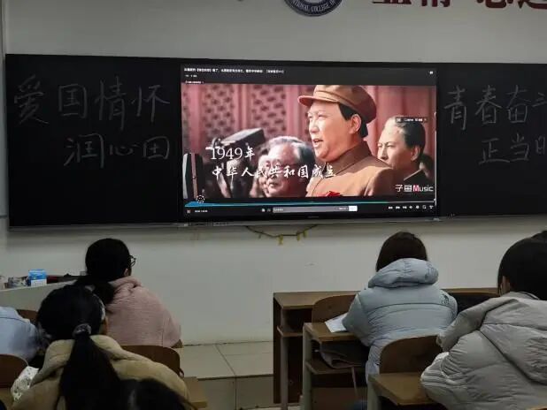 本次活动分早晚两场自习进行。清晨,冬阳初照的晨光洒进教室,全体同学齐声高唱《团结就是力量》,开启了阳光灿烂的一天。歌声不仅点燃了每个人的学习热情,更进一步增强了班级的凝聚力。当日晚自习,以观看九三大阅兵、抗日战争胜利八十周年等时政热点为契机,开展了以“铸就不屈脊梁 激扬爱国情怀”为主题的晚自习活动。通过观看《错位时空-五四特别版》和抗战胜利纪念视频剪辑等影像资料,激发了同学们的爱国热情。
