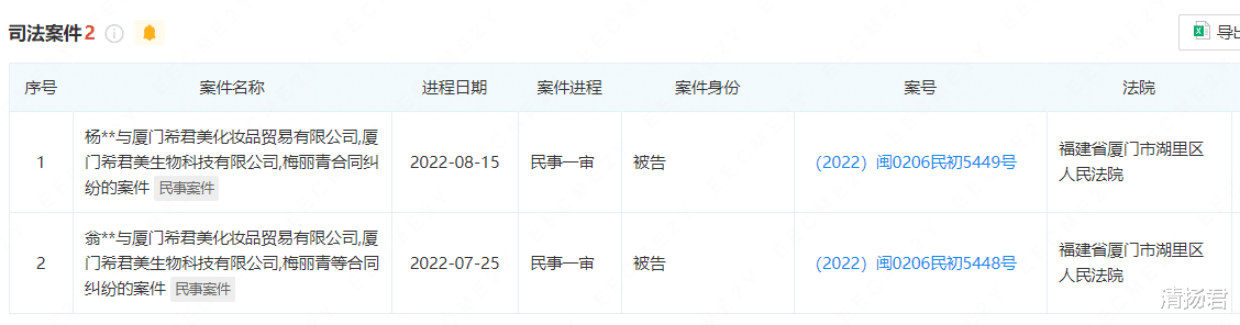 另外,厦门希君美、其关联公司厦门希君美生物科技有限公司以及梅丽青,均被杨某某、翁某某以合同纠纷为由提起诉讼。