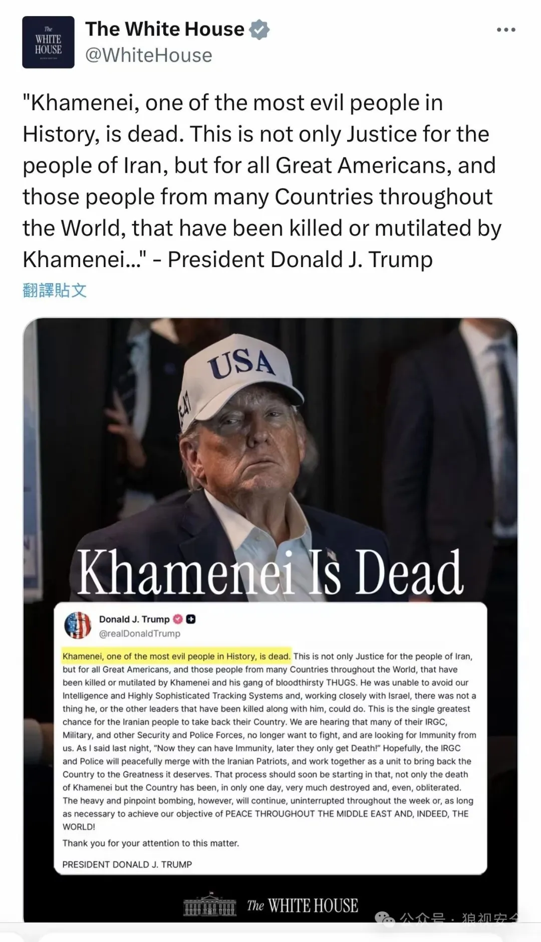 特朗普在今天早上表示,百分百确认哈梅内伊死亡。
