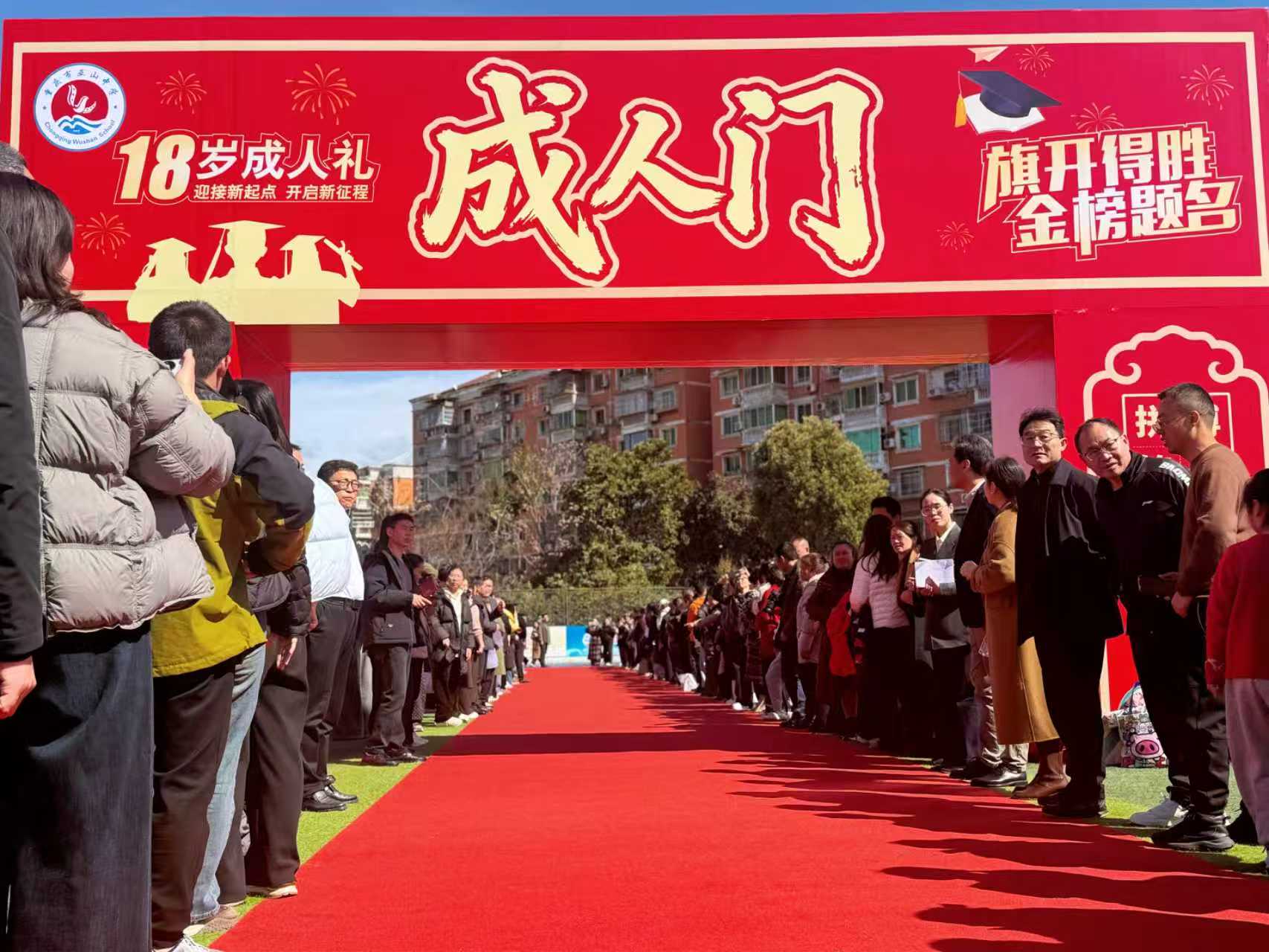 凯旋之际,家委会代表擂鼓相迎,激昂的鼓声响彻校园。同学们接过鲜花,踏过红毯,在老师们的掌声中昂首穿过“成人门”。“走过这道门,内心无比激动,这意味着我们从青年走向成年,真正担起那份职责与担当。”学生刘铭锐眼含热泪,“在这里,我也想对妈妈说:妈妈,你辛苦了!感谢你十八年来的培养,妈妈我爱你!”
