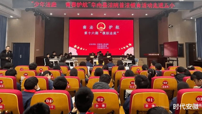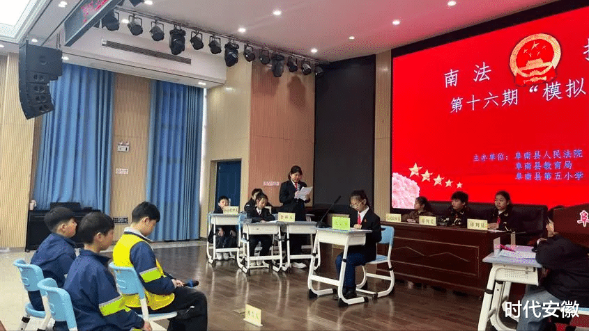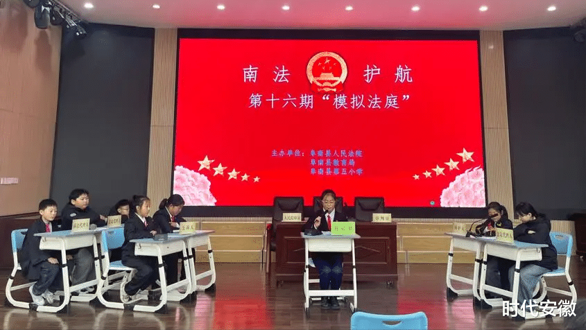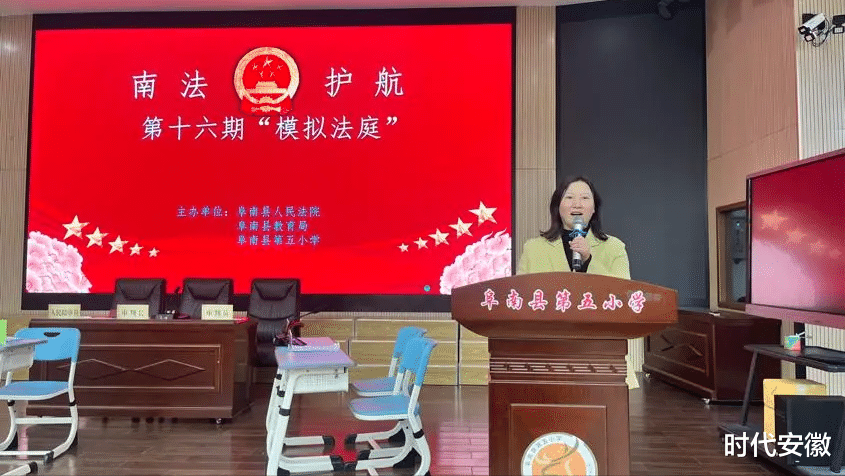 2025年11月26日,阜南五小报告厅内庄严肃穆,一场聚焦校园欺凌引发的故意伤害案的模拟法庭活动如期举行。14名学生化身“法官”“公诉人”“辩护人”“当事人”。