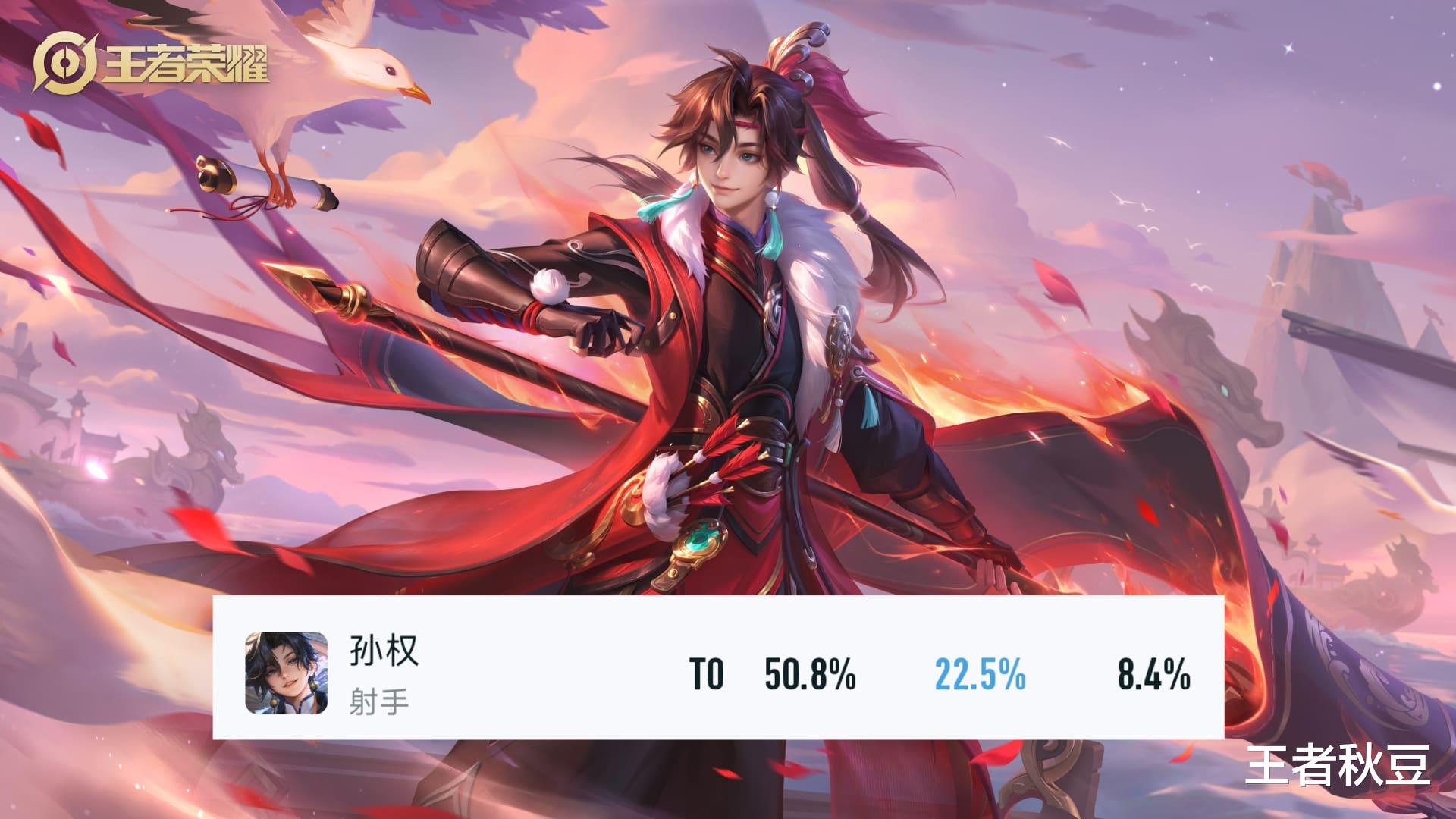 巅峰赛仅有的第二位T0热度英雄孙权,登场率22.5%全发育路第一名,胜率也有不错的50.8%。孙权的强度一直被低估,作为忍射,12级前唯唯诺诺,12级之后重锤出击,拯救队友于水火之中。加上新赛季修复了一个关键BUG,能让孙权可以提前0.2秒释放技能,提升孙权的操作上限。很多时候看着孙权前期作用不大,突然一波团战孙权就站了出来。