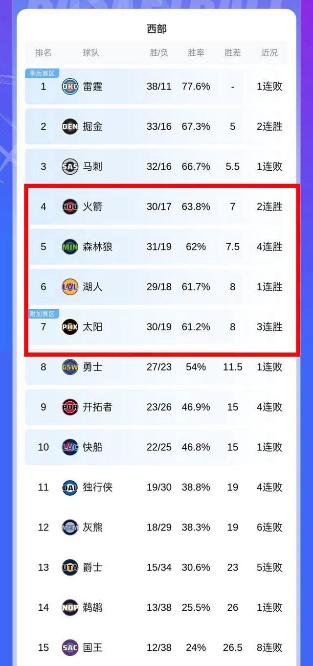这一通大战下来,西部第四到第七名的胜场差竟然只有一场球,这几支球队简直是挤成一团,每一场比赛的胜负都可能直接决定排名的升降,季后赛门票的争夺已经到了寸土必争的阶段。