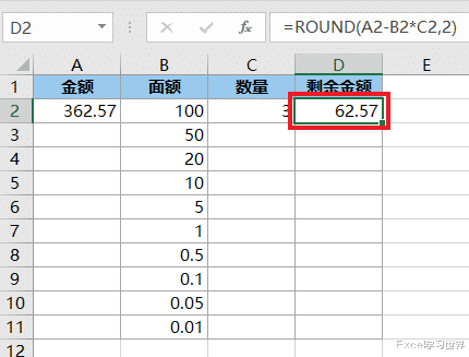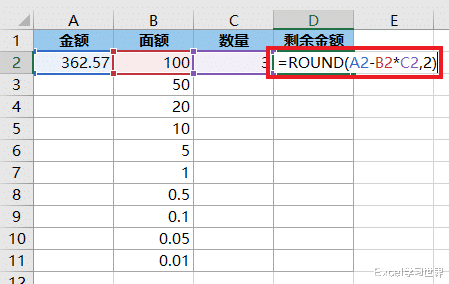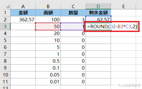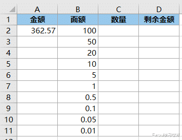 1. 在 B 列按降序顺序列出所有面值的金额,将 D 列设置为“剩余金额”列。