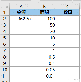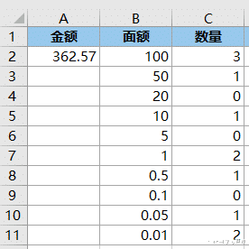 案例:计算出下图 1 的 A2 单元格中的金额分别需要多少数量的各种面额来凑?