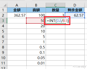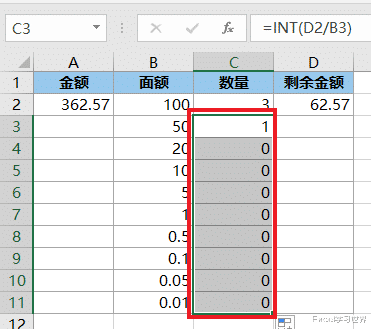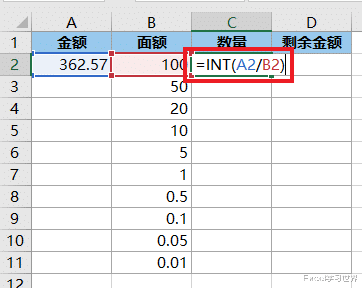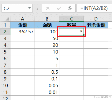 int 函数的作用是向下取整;将 A2 除以 B2 的余数向下取整后,已经算出了 100 面额能占到的最大数量。