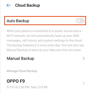 步骤2. 导航至管理云存储>云备份,启用自动备份功能。(您也可以在这里切换到立即备份以手动进行备份。)- 从OPPO云恢复OPPO手机:在OPPO手机上登录到同一个云账户以进入OPPO云。然后,您将看到之前的备份记录列表。从列表中选择您需要的内容,并在需要时将其传输到OPPO手机。