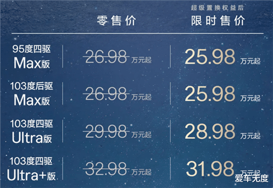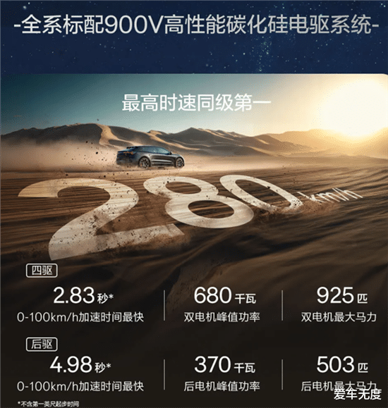 新车动力系统全面升级,全系车型采用全栈900V高压架构,车辆峰值功率680kW,最高车速280km/h,零百加速最快2.83秒,CLTC续航最长810km。