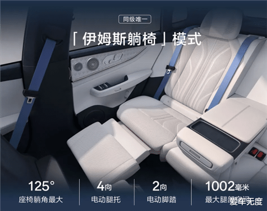 右后排还提供了“伊姆斯躺椅”模式,可令腿托几乎与坐垫平齐,并通过折叠前排座椅形成大躺椅。
