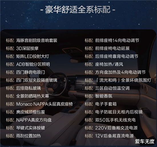 车内提供“海豚音”剧院级音响,峰值功率达4680W,打破车载音响功率的传统上限,舱内29个高