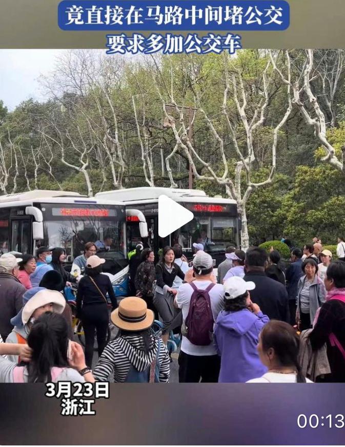 周末杭州游客可以说是人山人海,游客一多最容易发生问题就是交通拥堵,2025年3月23日,适逢周末,一支来自北京老年旅行团,在雷峰塔附近坐不上车,就集体站路中间堵住公交车,导致发生道路大量堵车。