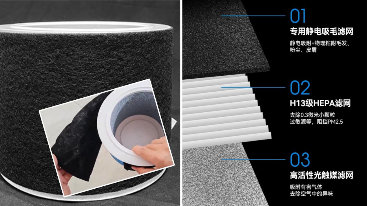 选购内幕二:只看滤芯层数,不看材质与工艺商家话术:“我们是六层滤网、八重净化,比别人多两层!”事实真相:滤网数量多不代表过滤效果好。很多品牌在滤芯上“堆层数”凑噱头,用普通棉布或低活性炭混合物,寿命短、吸附能力弱。真正决定净化效果的,是滤材的密度、活性炭比表面积以及是否带光触媒或UV紫外线模块。避坑建议:宠物空气净化器吸猫毛哪个牌子好?别数层数,看结构。选 HEPA13 + 高密活性炭滤棉 + 光触媒层的组合;同时问清楚滤芯寿命(低于3个月的基本不行)。