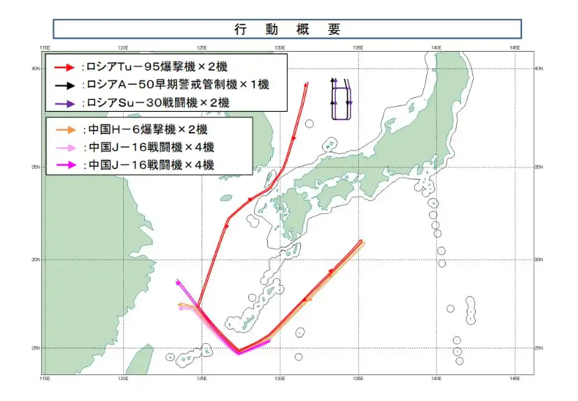俄方战机包括2架图-95轰炸机,1架A-50预警机,2架苏-30系列战斗机。