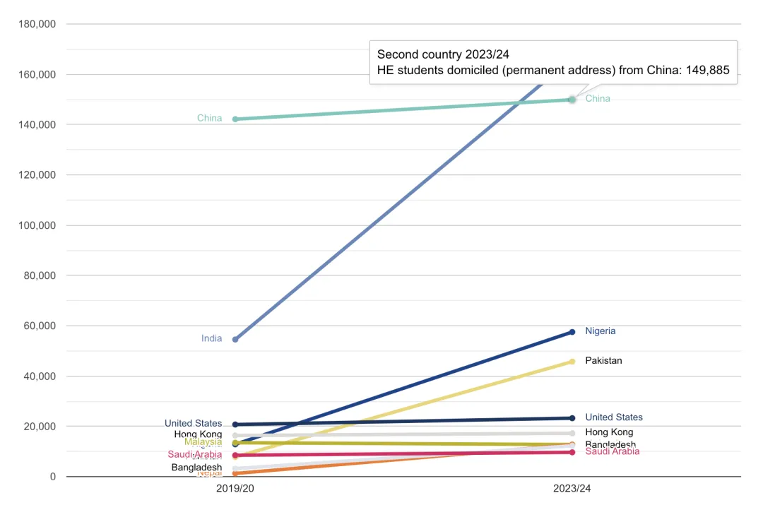 据HESA公布的数据,2023/24学年中国大陆在英留学生人数达149,885人,占非欧盟国家学生总数的32%。2025年秋季申请数据显示,本科录取中国学生12,380人,同比增长13%。截至2025年11月,中国留学生在英总人数已超过16万人。