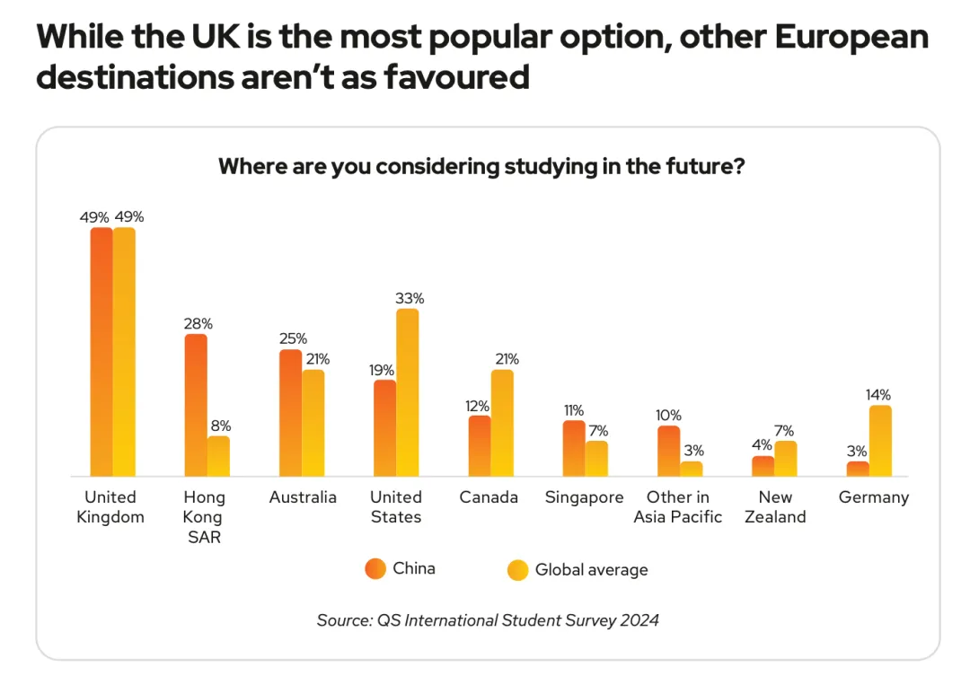 尽管面临新政策挑战,英国仍是中国学生海外求学的热门选择。根据2024年QS国际学生调查数据,英国以49%的支持率位居中国学生未来留学目的地榜首,全球范围内亦有49%的学生选择英国。中国学生热爱的求学目的地排名中,中国香港(28%)、澳大利亚(25%)、美国(19%)、加拿大(12%)分列二至五位。