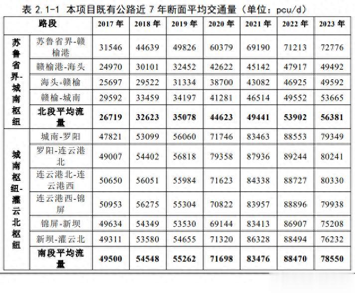那么,沈海高速公路赣榆至灌云段为何要进行扩建呢?该项目的规划设计单位通过技术手段进行综合分析,也是得出了该段高速公路2017-2023年断面平均交通量的主要数据,具体如下: