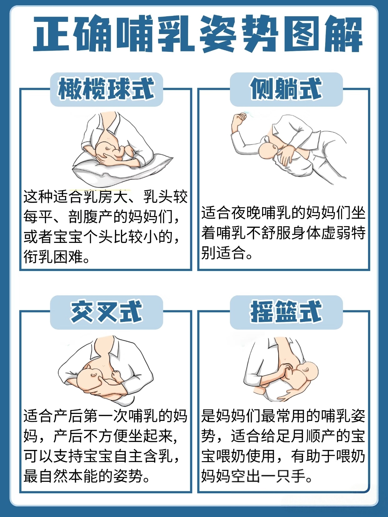 摇篮式:最经典的姿势,适合大多数妈妈。用手臂托住宝宝头颈,让宝宝侧身面向乳房。