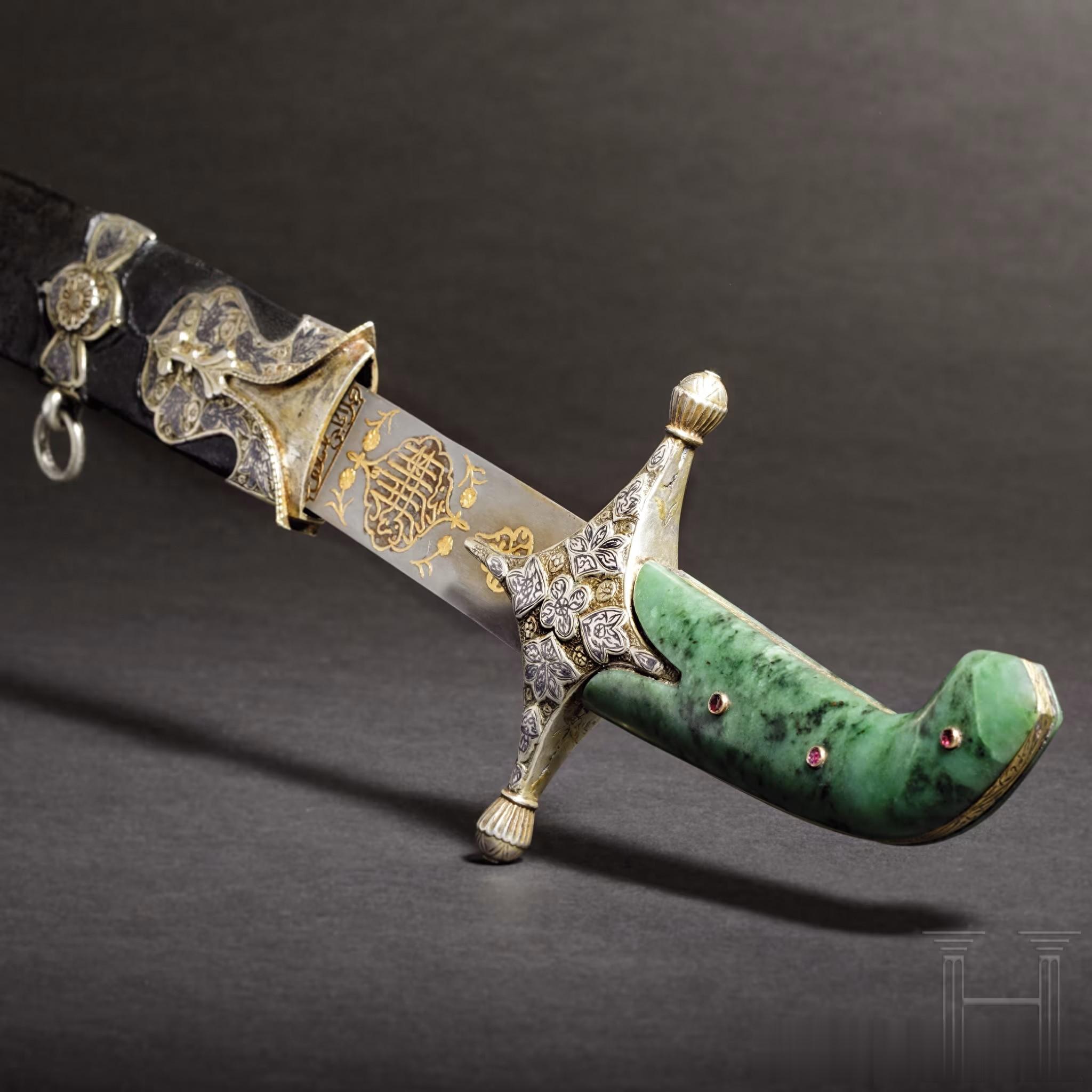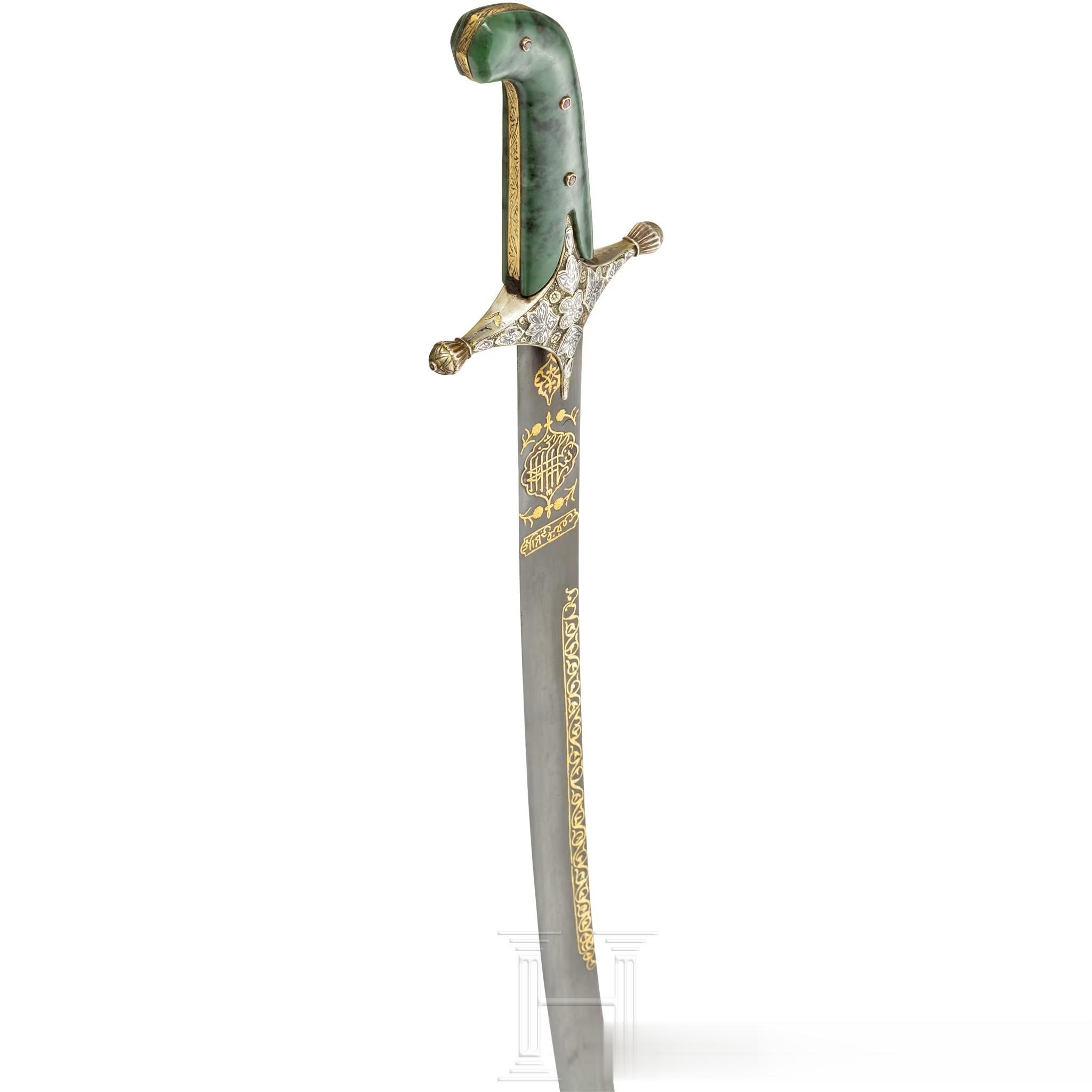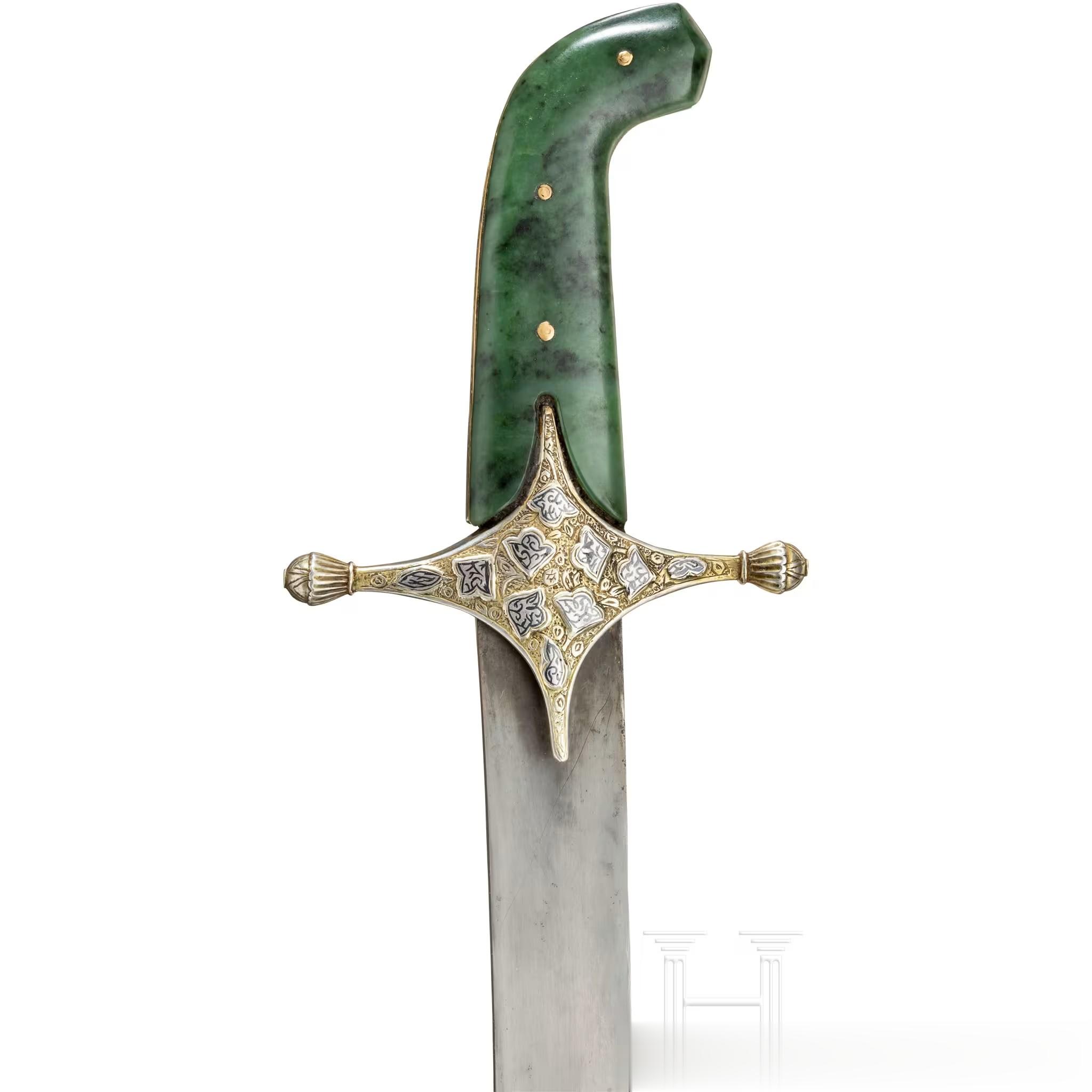 奥斯曼帝国镶银、嵌镍黑、鎏金且配和田玉柄的基利弯刀