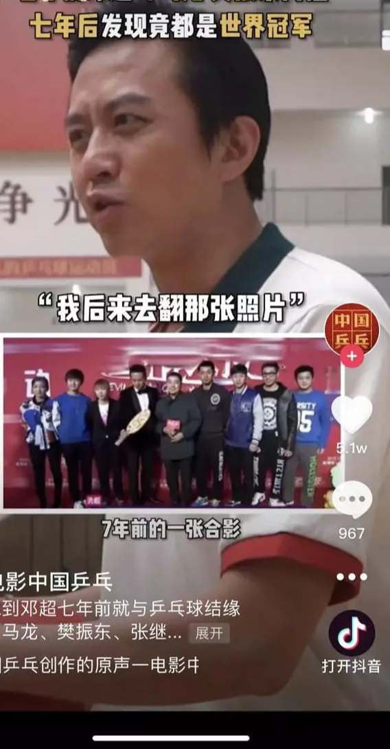 为了宣传自己的这部电影,邓超宣称七年前自己就与乒乓球结缘,七年前的一张不经意的合照里,有着世界冠军马龙、樊振东、张继科等。