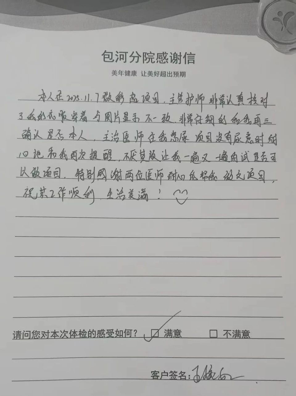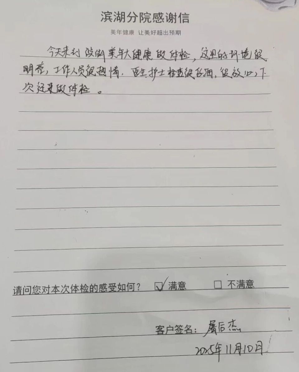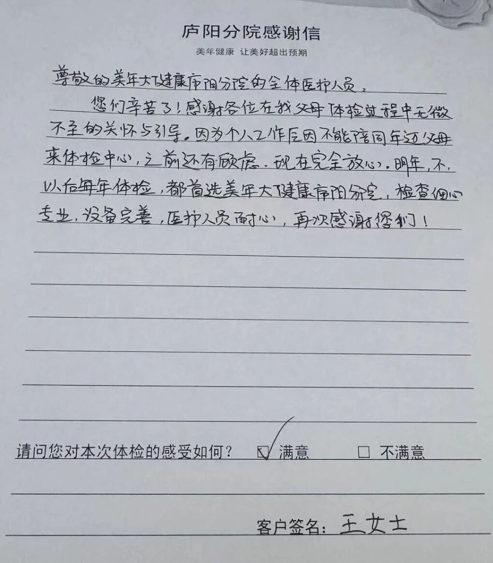 王女士在信里说 “这种‘较真’不是麻烦,是对健康负责”,这份认可也让她在同事间推荐 “找‘合肥专业体检中心’就选包河美年,连身份核对、检查准备都这么严谨,健康有保障”—— 毕竟,体检的专业性,才是大家选择体检中心的首要标准。